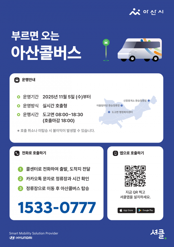 [금요저널] 아산시가 도고면 지역의 관광 활성화와 주민들의 이동 편의성 제고를 위해 오는 11월 5일부터 수요응답형 공공형 버스 ‘아산콜버스’를 시범 운행한다.