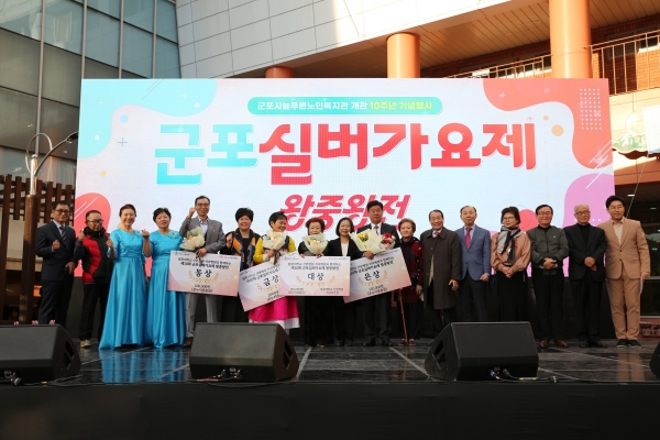 [금요저널] 군포시늘푸른노인복지관은 10월 21일 개관10주년을 기념해 원광대학교 산본병원·치과병원과 함께하는 ‘군포실버가요제 왕중왕전’을 복지관 열린광장에서 지역주민과 지역어르신 약1,500명과 함께하며 성황리에 개최했다.
