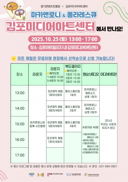 주요 프로그램으로는 △마카앤로니 시즌3 애니메이션 상영 △움직이는 스톰&웬디와 사진촬영 △마카앤로니 페이스페인팅 체험 △내가 그린 그림이 움직이는 모션영상 제작 체험 △마카앤로니 포토존 △영상스튜디오 견학 △복도 갤러리 전시 관람 등이 준비됐다.