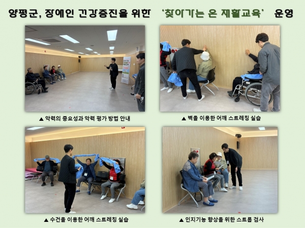 [금요저널] 양평군은 지역 장애인의 건강 증진과 재활 역량 강화를 위해 23일과 30일 양일간 ‘찾아가는 온 재활교육’을 운영한다고 밝혔다.