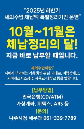 나주시 관계자는 “세외수입은 지방세와 함께 지역 발전을 위한 주요 재원”이라며 “경제 여건을 고려한 맞춤형 체납 관리로 시민 부담을 줄이고 공정한 납세 문화 확립과 건전한 재정 운영에 최선을 다하겠다”고 말했다.