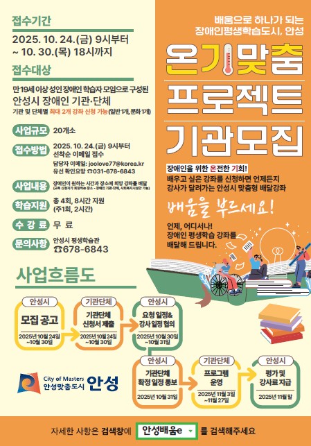 [금요저널] 안성시는 장애인 평생학습도시로서 이동의 불편을 해소하고 학습권을 보장하기 위해 오는 10월 30일까지 ‘찾아가는 장애인 평생학습 온기맞춤 프로젝트’에 참여할 장애인 기관·단체를 모집한다.