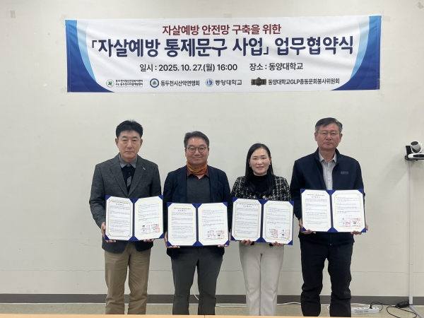 [금요저널] 동두천시정신건강복지센터 부설 자살예방센터는 지난 27일 동양대학교에서 자살 예방 환경 조성을 위한 ‘자살예방 통제문구 설치사업’ 추진과 관련해 동두천시산악연맹회, 동양대학교, 동양대학교 GLP총동문회 봉사위원회와 업무협약을 체결했다.