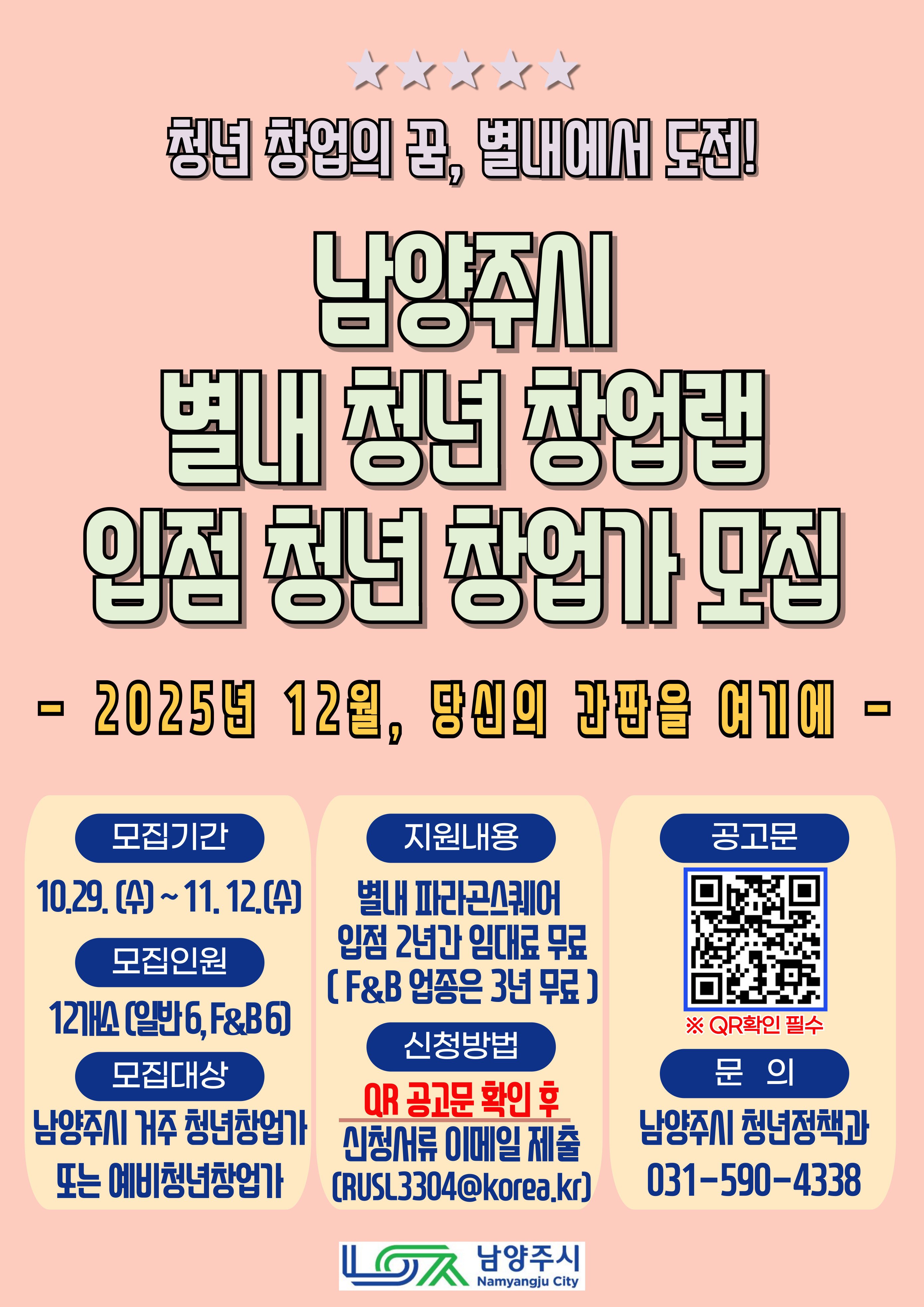남양주시,‘별내 청년 창업랩’입점 청년 창업가 모집(포스터)