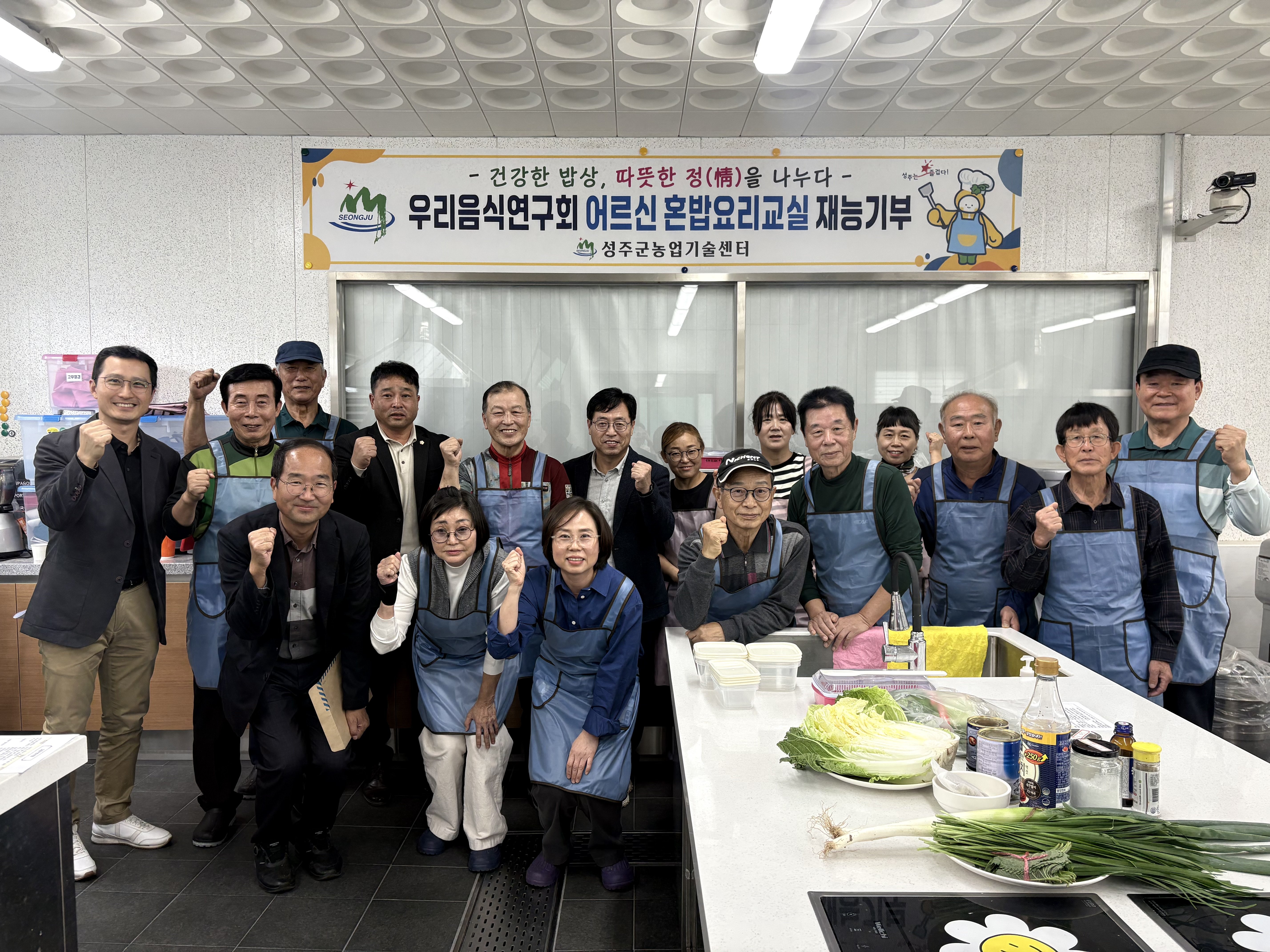 [금요저널] 성주군은 우리음식연구회의 재능기부로 어르신들의 건강한 식생활 실천과 자립적인 식사 준비 능력 향상을 위해 10월 30일 농업기술센터 조리교육장에서 수륜면 노인회 11명을 대상으로 ‘어르신 혼밥요리교실’개강식을 가졌다.