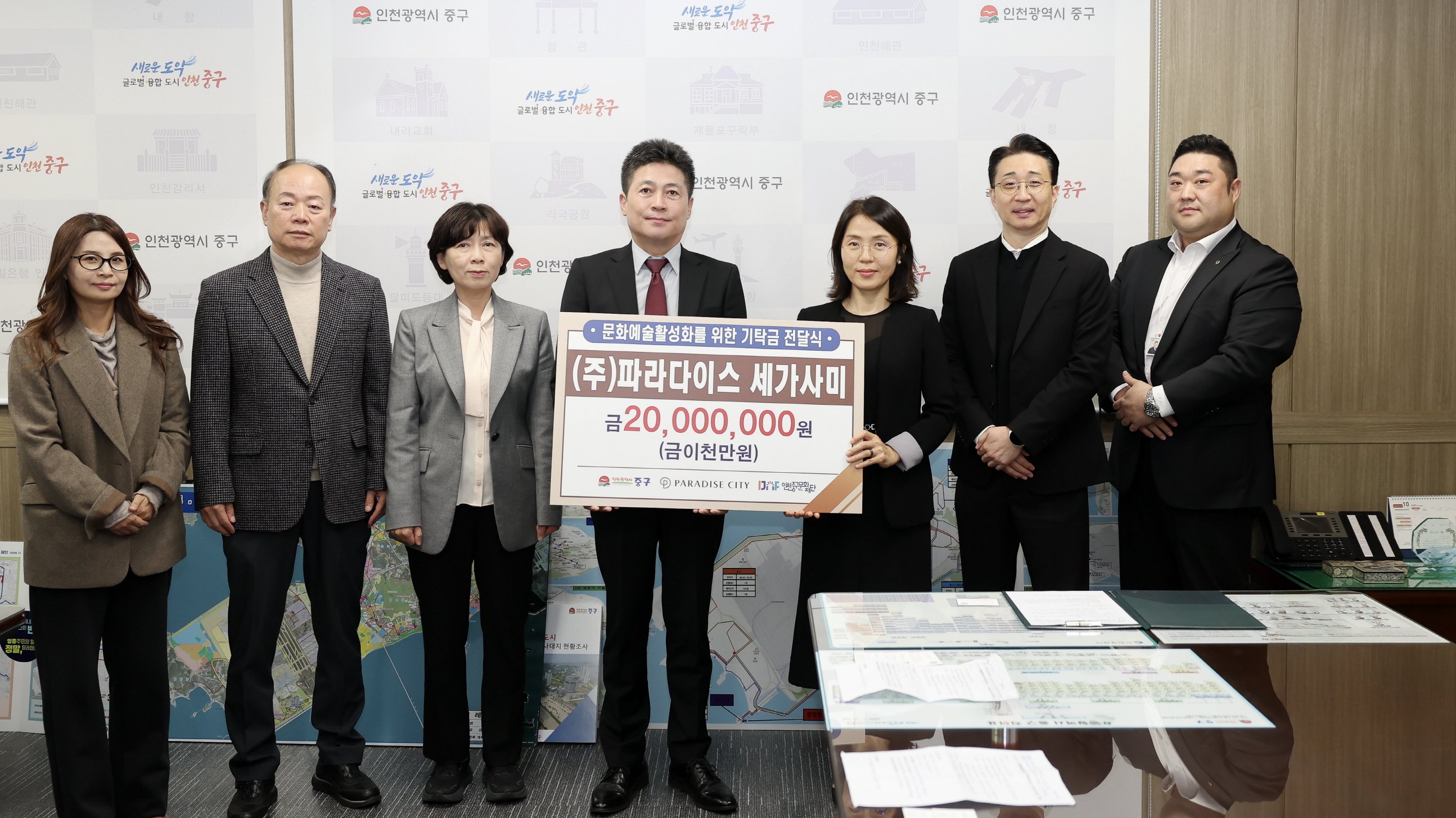 현금 기탁식은 지난 30일 오후 중구 제2청사 구청장실에서 김정헌 중구청장, ㈜파라다이스세가사미 배현미 상무이사, 인천중구문화재단 사무국장 등이 참여한 가운데 진행됐다.