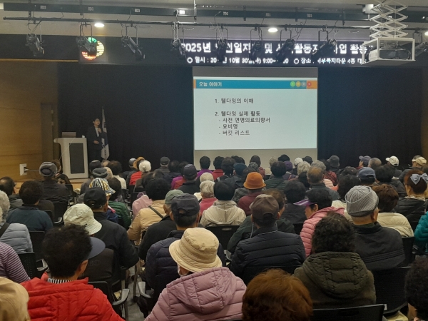 이번 교육은 어르신들이 삶의 마지막을 긍정적으로 준비하고 품위 있고 존엄하게 삶을 마무리할 수 있도록 돕기 위해 마련됐으며 웰다잉협회 전문 강사를 초빙해 존엄사의 개념과 필요성을 시작으로 연명 의료결정 제도의 이해, 나의 버킷리스트 작성, 인생노트 작성 등의 내용으로 진행됐다.