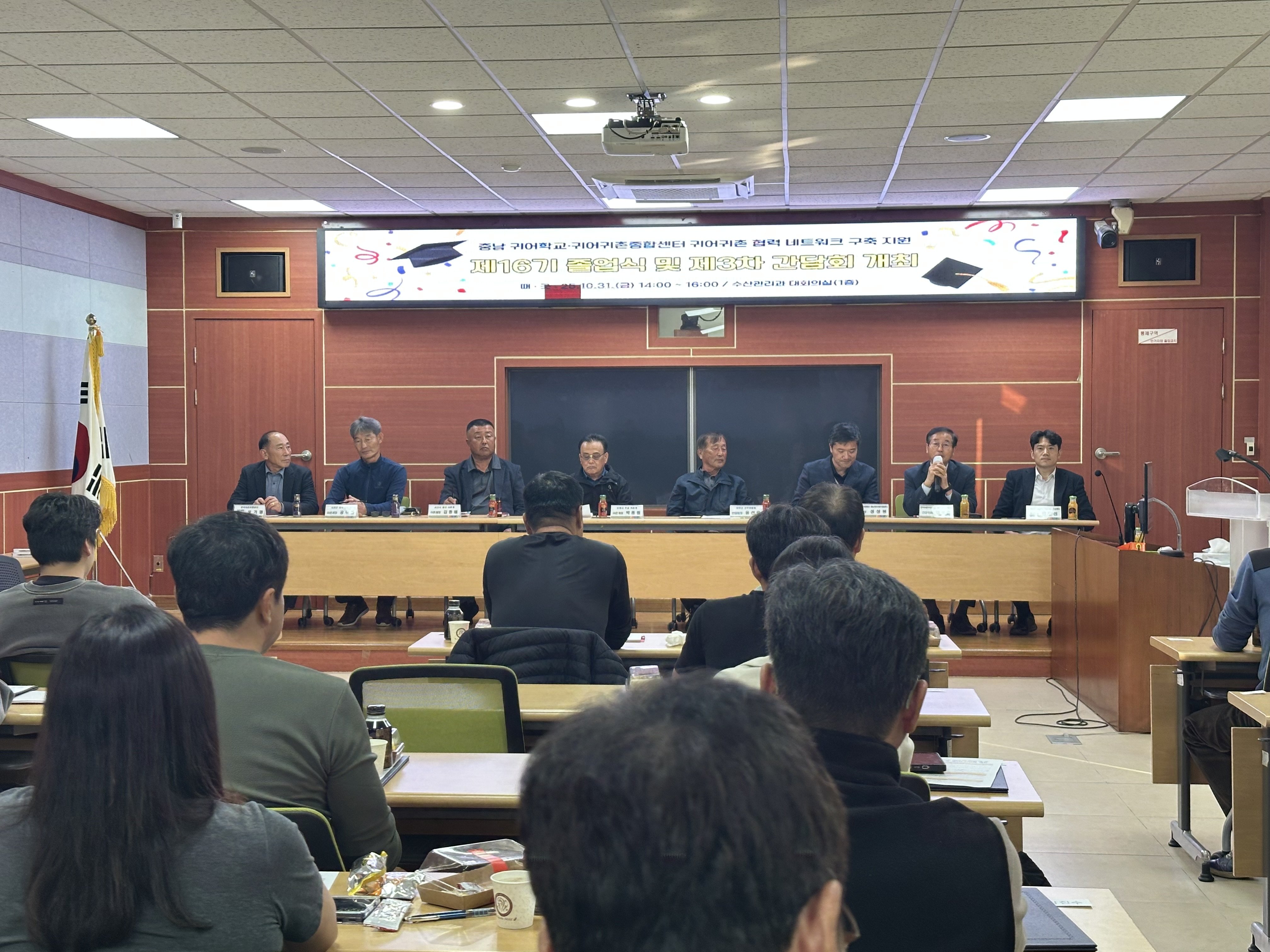 충남 귀어학교 관계자와 졸업생, 예비 귀어인, 귀어귀촌종합센터 관계자, 어촌계, 수산 전문가 등 40여명이 참석한 가운데, 이번 행사는 제16기 귀어학교 수강 영상 상영, 모범학생 도지사 표창, 졸업생 졸업장 증정, 귀어 실태조사 결과 발표, 초청 전문가 설명, 귀어 시책 안내, 질의응답 등의 순으로 진행했다.