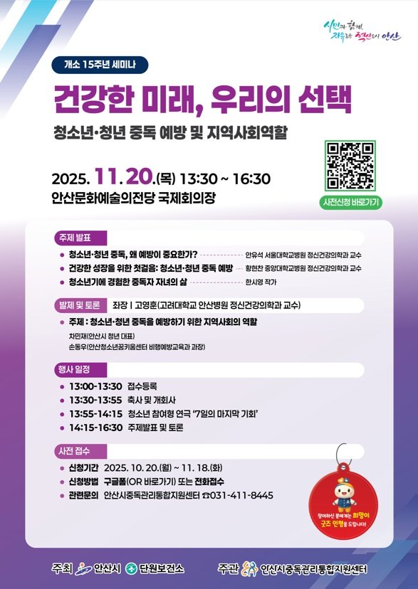 [금요저널] 안산시(시장 이민근) 중독관리통합지원센터(이하 ‘센터’)는 오는 20일 안산문화예술의전당 국제회의장에서 개소 15주년을 맞아 ‘건강한 미래, 우리의 선택: 청소년·청년 중독 예방 및 지역사회역할’을 주제로 기념 세미나를 개최한다고 4일 밝혔다.