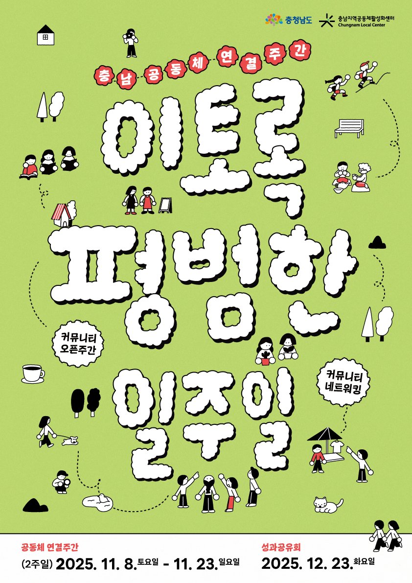 이번 주간은 ‘이토록 평범한 일주일’이라는 주제로 충남 곳곳의 마을·단체·공동체가 일상 속에서 열어가는 커뮤니티 주간 프로그램이다.
