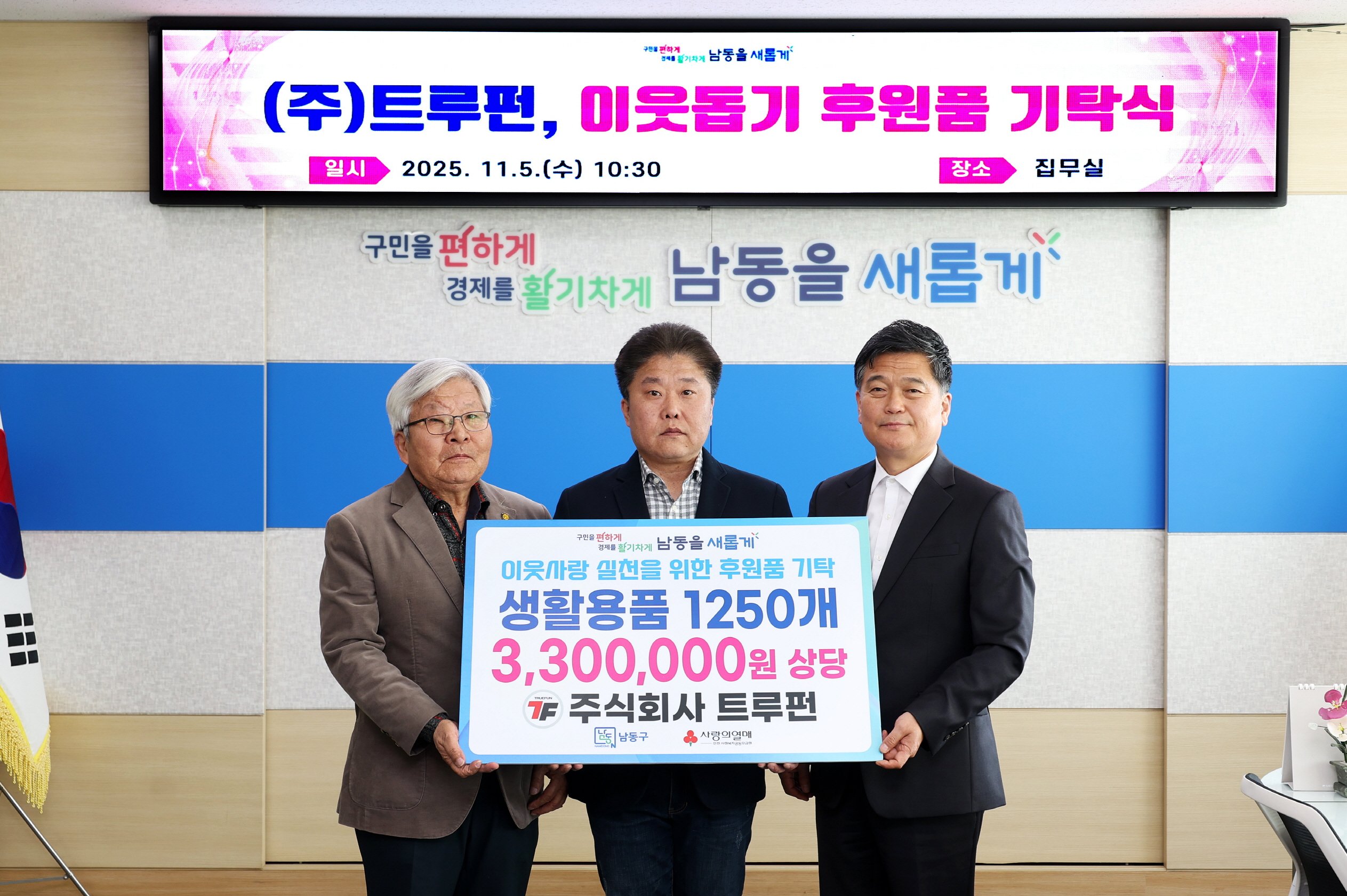박종효 남동구청장은 “어려운 이웃을 위해 따뜻한 나눔을 실천해 주신 ㈜트루펀에 깊이 감사드린다”며 “기탁한 물품은 꼭 필요한 분께 소중히 전달하겠다”고 말했다.