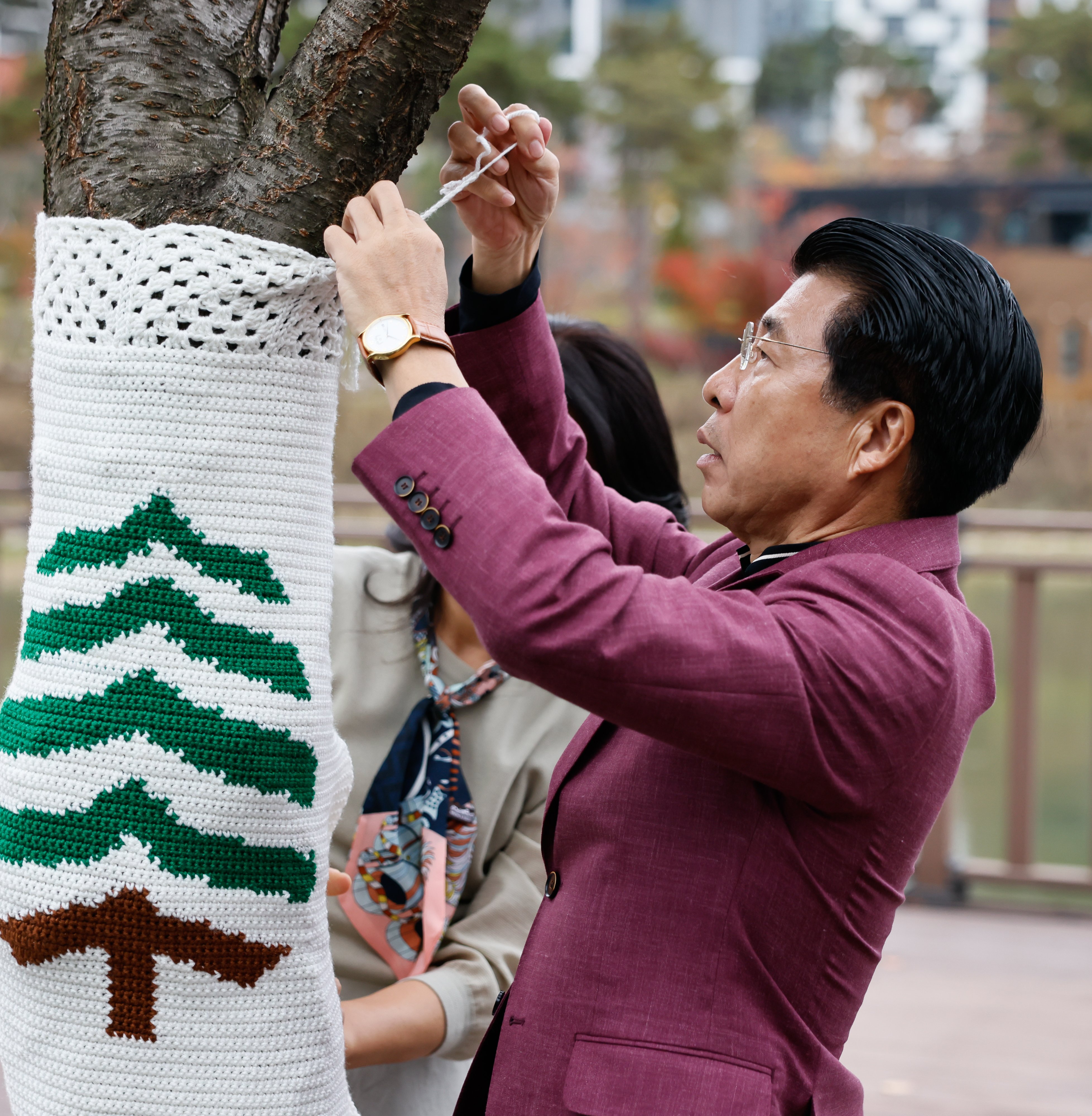 이들이 만든 다채로운 뜨개옷은 위례호수공원 산책로를 따라 나무 132그루에 설치돼 겨울을 앞둔 공원에 따뜻한 색감과 이야기를 더한다.
