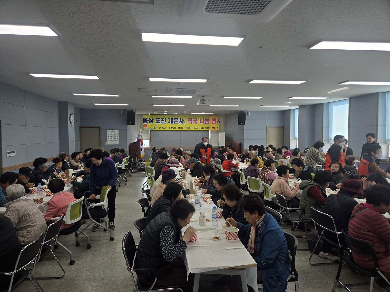 [금요저널] 11월 5일, 안동시 송천동에 위치한 개운사에서 용상동 행정복지센터 3층에서 지역 어르신 500명을 대상으로 ‘사랑의 떡국 나눔 행사’를 진행했다.