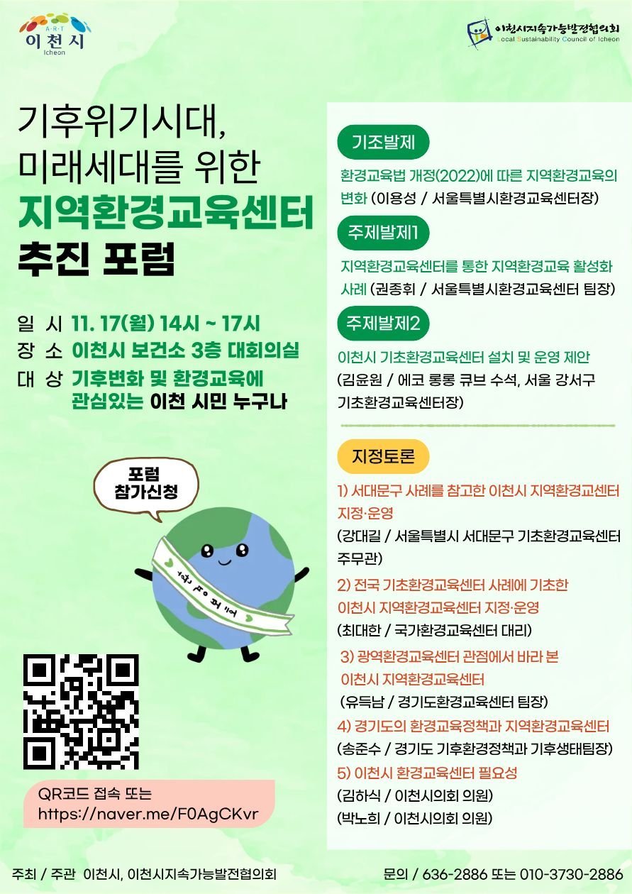 이번 포럼은 기후변화 대응과 지역 환경교육 활성화 방안을 논의하기 위해 마련된 자리로 환경교육에 관심 있는 이천시민 누구나 참여할 수 있으며 네이버 폼을 통해 사전 신청이 가능하다.