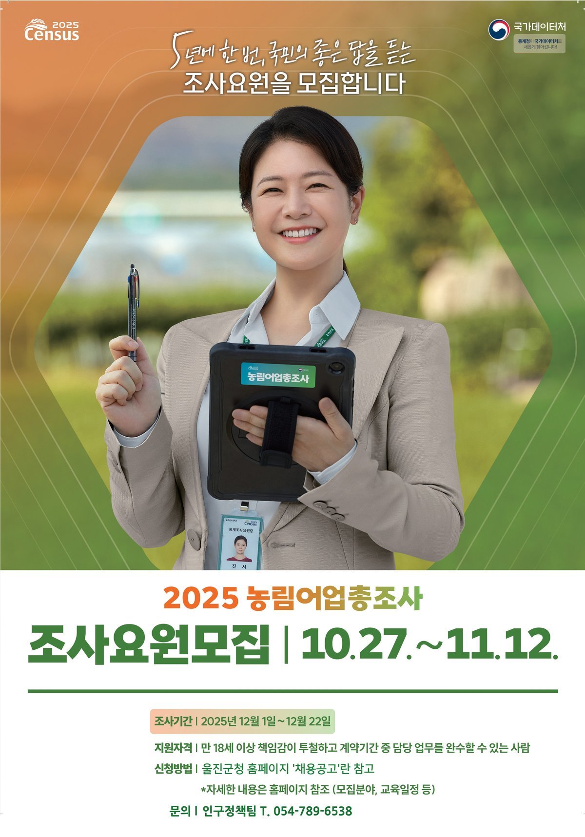 [금요저널] 울진군은 오는 12월 실시되는 ‘2025 농림어업총조사’의 원활한 추진을 위해 조사요원 67명을 모집한다.