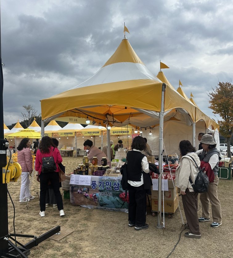 [금요저널] 영주시는 지난 11월 8일부터 9일까지 경주 월정교 남쪽 공원부지에서 열린 ‘2025 시월애마지막밤 커피빵 페스타’에 참가해 지역 대표 특산물인 풍기 인삼과 다양한 가공제품을 선보이며 영주 인삼의 우수성을 널리 알렸다.