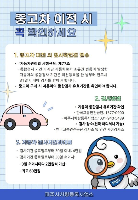 [금요저널] 파주시는 중고차 이전등록 시 종합검사 의무를 알지 못해 과태료가 부과되는 사례를 예방하기 위해 취득세 납부 단계에서 ‵종합검사 의무 이행 안내문′을 함께 제공해 시민들이 기한 내 검사를 받을 수 있도록 적극 홍보할 계획이라고 밝혔다.