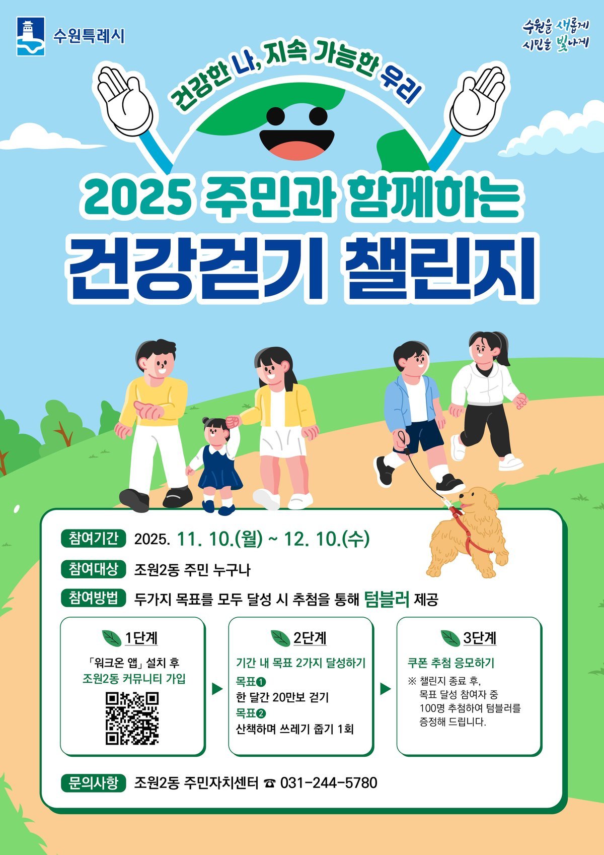 [금요저널] 수원시 장안구 조원2동 주민자치회는 2025년 주민자치 활성화 사업의 일환으로 11월 10일부터 12월 10일까지 한 달간 ‘2025 주민 건강걷기 챌린지’를 진행한다고 밝혔다.