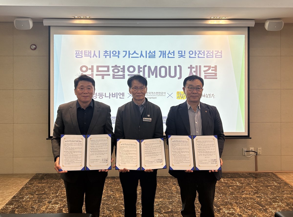 [금요저널] 평택시사회복지협의회 평택행복나눔본부는 지난 5일 한국가스안전공사 경기광역본부, ㈜경동나비엔과 함께 ‘평택시 취약 가스시설 개선 및 안전점검’ 3자 업무협약을 체결했다.