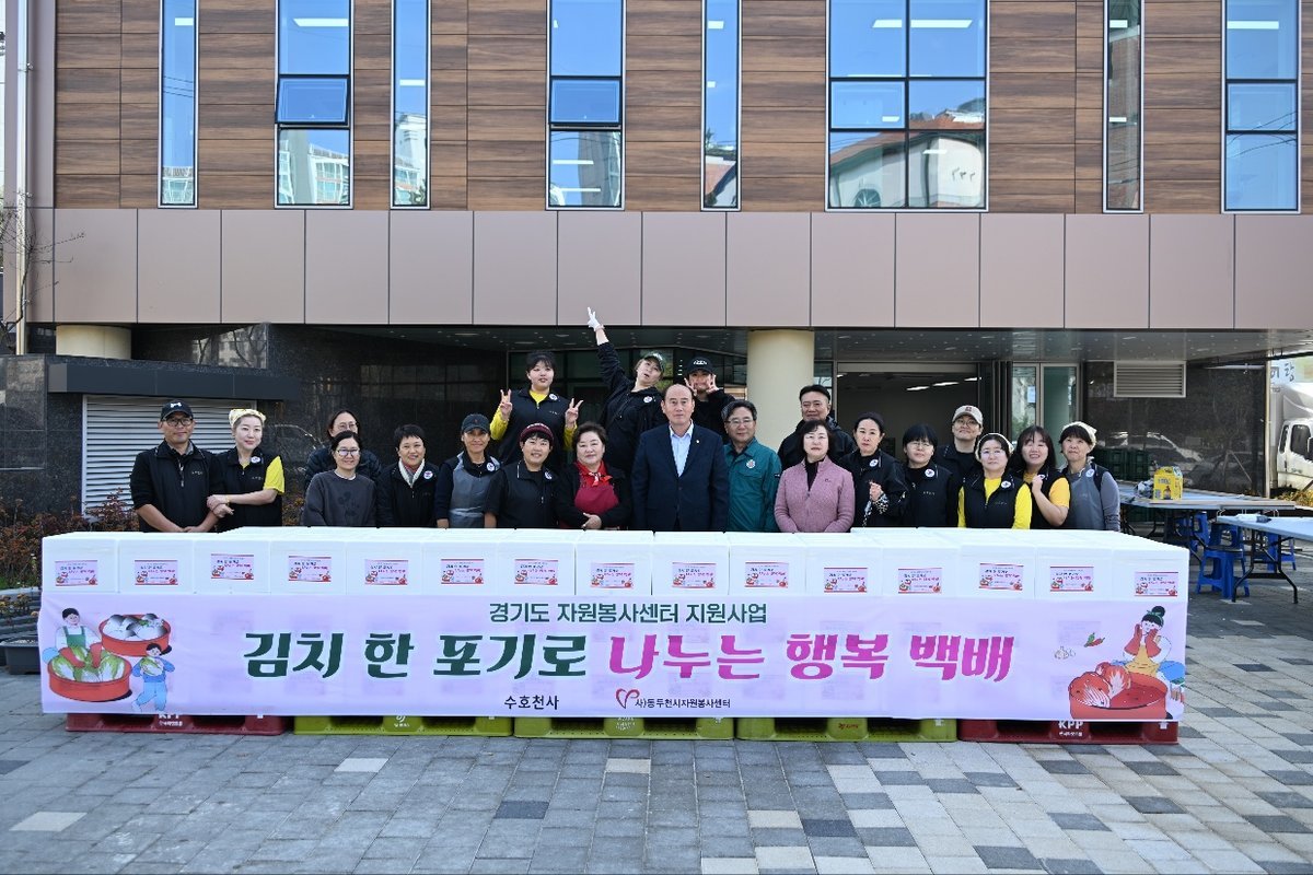 [금요저널] 동두천시 수호천사 봉사단은 지난 13일 송내동 행정복지센터에서 자원봉사자 30여명이 참여한 가운데 ‘김치 한 포기로 나누는 행복 백배’봉사활동을 진행했다.