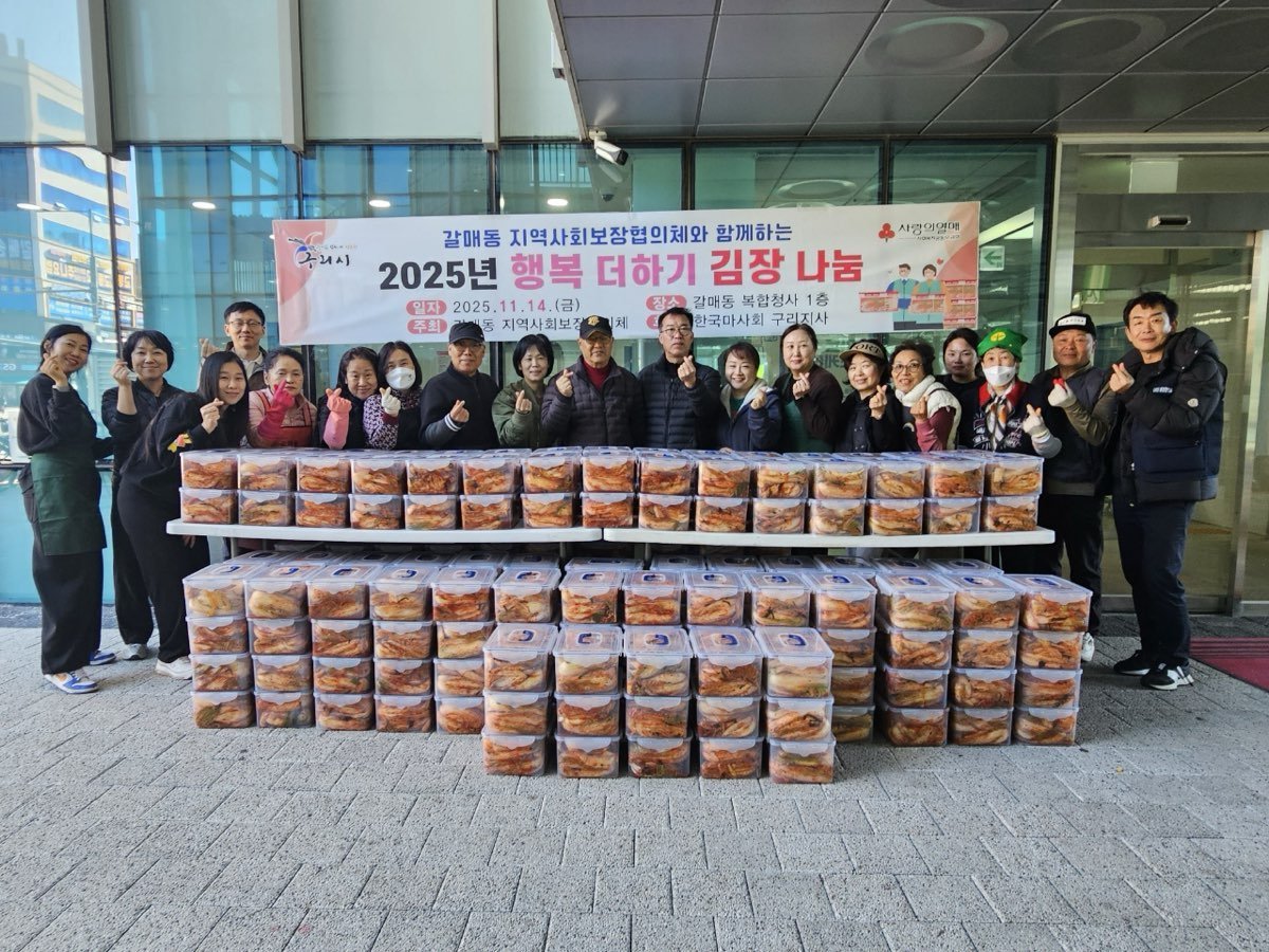 [금요저널] 구리시 갈매동 지역사회 보장협의체는 11월 14일 한국마사회 구리지사의 후원과 경기도사회복지공동모금회의 지원으로 ‘행복 더하기 김장 나눔’행사를 진행했다고 밝혔다. 이번 행사는 갈매동 지역사회 보장협의체가 한국마사회 구리지사 공모사업에 선정되어 확보한 600만원의 후원금을 바탕으로 추진됐으며 차가운 날씨 속에서도 이웃을 위한 정성과 나눔의 열기로 현장이따뜻하게 물들었다. 이번 행사는 갈매동 지역사회 보장협의체가 한국마사회 구리지사 공모사업에 선정되어 확보한 600만원의 후원금을 기반으로 추진된 것으로 차가운 날씨 속에서도 이웃을 위한 정성과 나눔의 열기로 현장이 따뜻하게 물들었다. 이날 협의체 위원과 자원봉사자들이 정성껏 담근 김장 김치는 갈매동 내 약 200가구의 취약계층에 전달될 예정이다. 박정렬 민간위원장은“추운 날씨에도 이른 시간부터 함께해 주신 모든 분께 감사드리며 이번 김장 나눔이 어려운 이웃들에게 작은 힘과 위로가 되길 바란다”고 전했다. 백경현 구리시장은“정성껏 담근 김장 김치가 단순한 식재료가 아니라 이웃에게 따뜻한 마음과 큰 위로가 되길 바란다”며“나눔에 동참해 주신 지역 주민과 협의체 관계자분들께 진심으로 감사드린다”고 말했다.