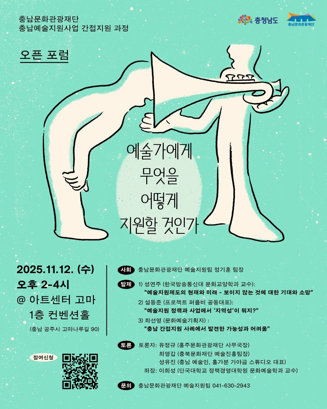 충남문화관광재단은 지난 11월 12일 아트센터 고마에서 ‘2025 충남예술지원사업 간접지원 과정 오픈 포럼’을 성황리에 개최했다.