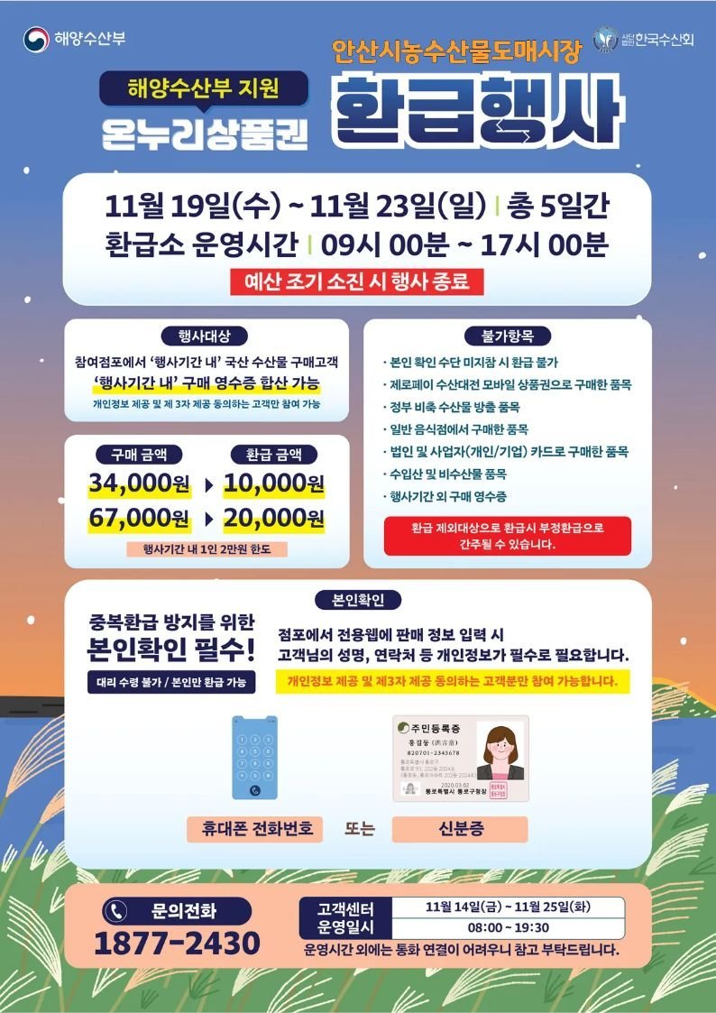 [금요저널] 안산시는 다가오는 김장철을 맞아 11월 19일부터 11월 23일까지 수산물 소비촉진 및 도매시장 활성화를 위해 ‘김장철 온누리상품권 환급행사’를 진행한다고 17일 밝혔다.