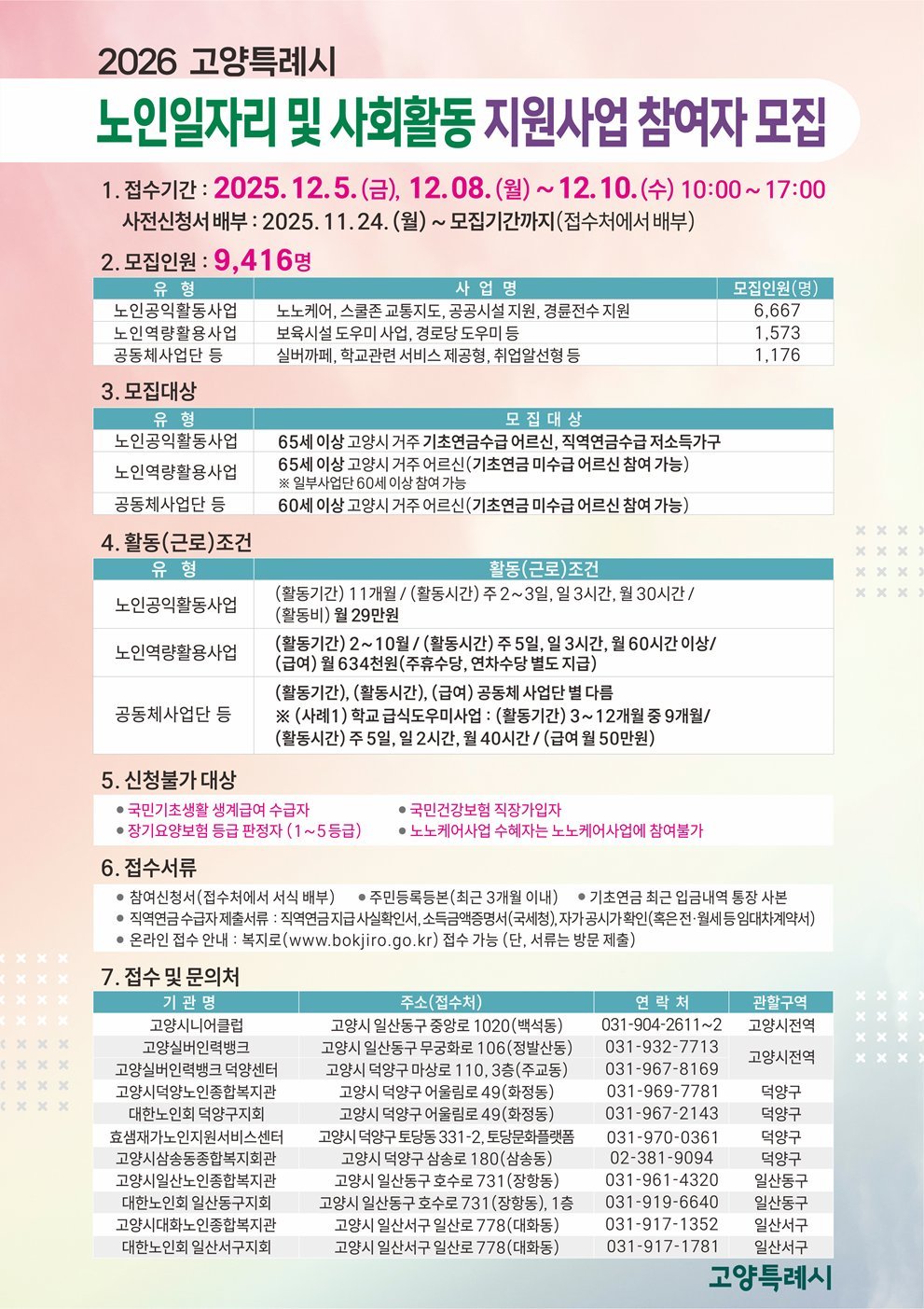 [금요저널] 고양특례시는 2026년 노인일자리 및 사회활동지원 사업에 총 382억원을 투입해, 노인일자리 참여자 9,416명을 수행기관별 통합 모집한다고 밝혔다.