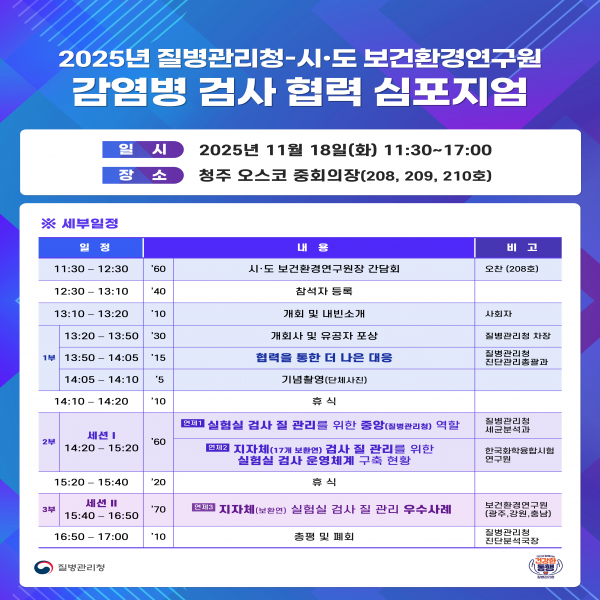 [금요저널] 질병관리청은 11월 18일 충청북도 청주 오스코에서 전국 17개 시·도 보건환경연구원과 함께 ‘감염병 검사 협력 심포지엄’을 개최한다.