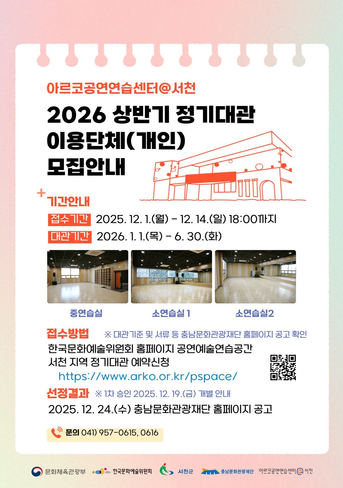[금요저널] 충남문화관광재단은 12월 1일부터 12월 14일까지 2026년 아르코 공연연습센터@서천의 상반기 정기대관 이용 단체 및 예술인을 모집한다.