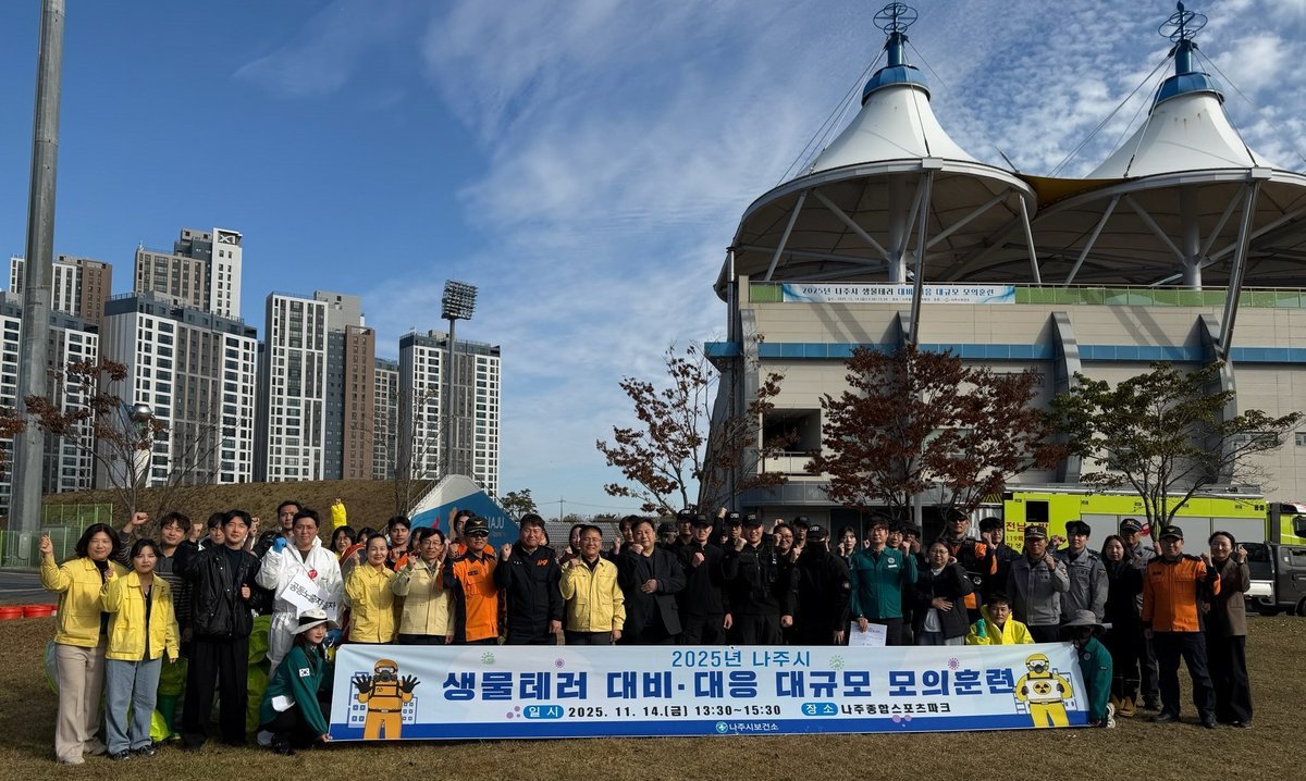 나주시가 지난 14일 나주종합스포츠파크에서 2025년 생물테러 대비 대응 대규모 훈련 을 실시했다