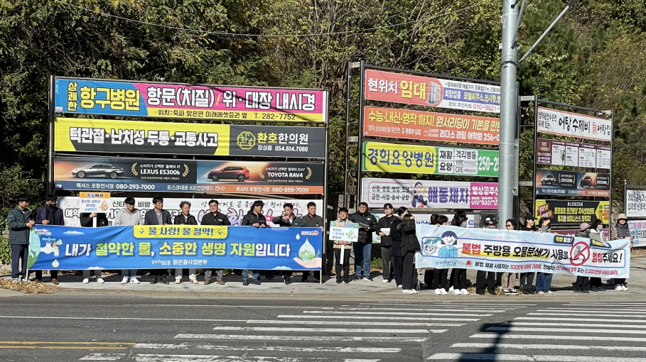포항시는 21일 장성동 두산위브사거리 일원에서 ‘시민과 함께하는 물 사랑’ 캠페인을 진행하며 생활 속 물 절약 실천과 불법 오물분쇄기 사용 근절을 홍보했다.