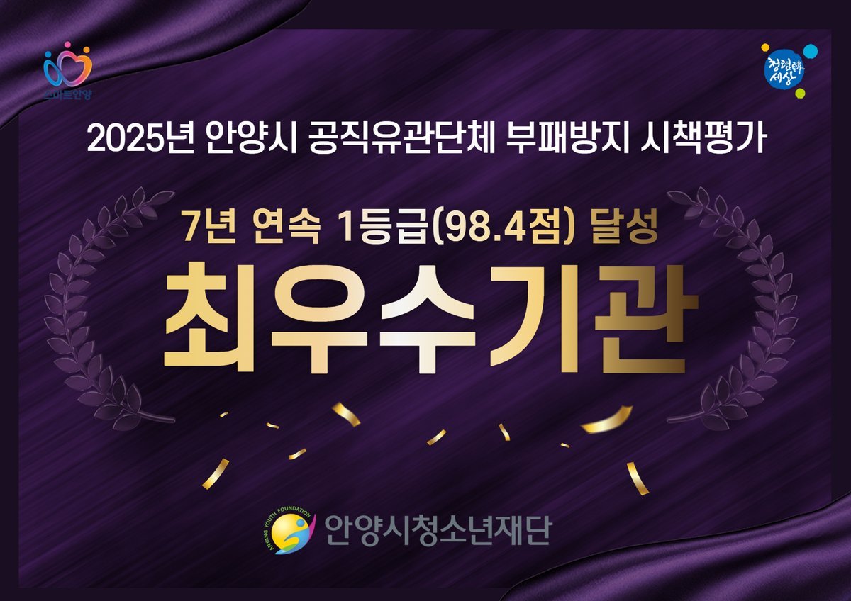안양시청소년재단, 2025년 안양시 공직유관단체 부패방지 시책평가‘7년 연속 최우수기관 선정’쾌거