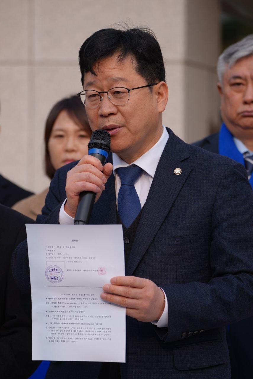 [금요저널] 안호영 국회 기후에너지환경노동위원장을 비롯한 더불어민주당 김문수·윤종군·이재강 의원은 11월 24일 오전, 서울 서초구 대법원 앞에서 김용 전 민주연구원 부원장 사건의 조속한 선고를 촉구하는 기자회견을 열고 촉구의견서를 제출했다.