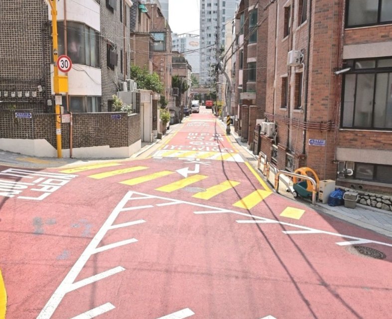 신중초등학교 주변 내리막길에는 차량의 감속을 유도하는 지그재그 노면 표시와 적색 미끄럼방지 포장을 도입하고, 노란 횡단보도를 설치해 가시성을 높였다.