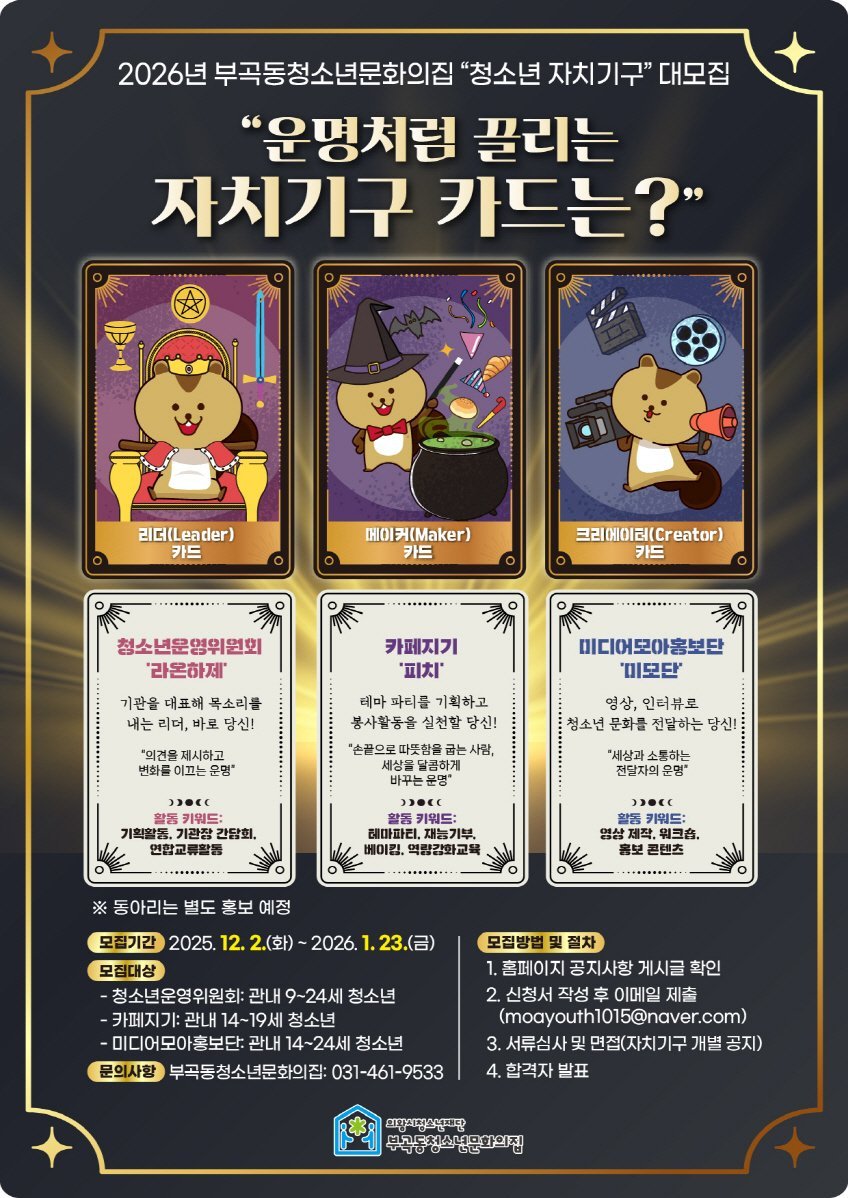 [금요저널] 의왕시청소년재단 산하 부곡동청소년문화의집이 2026년도 청소년 자치기구 참가자를 12월 2일부터 2026년 1월 23일까지 모집한다.