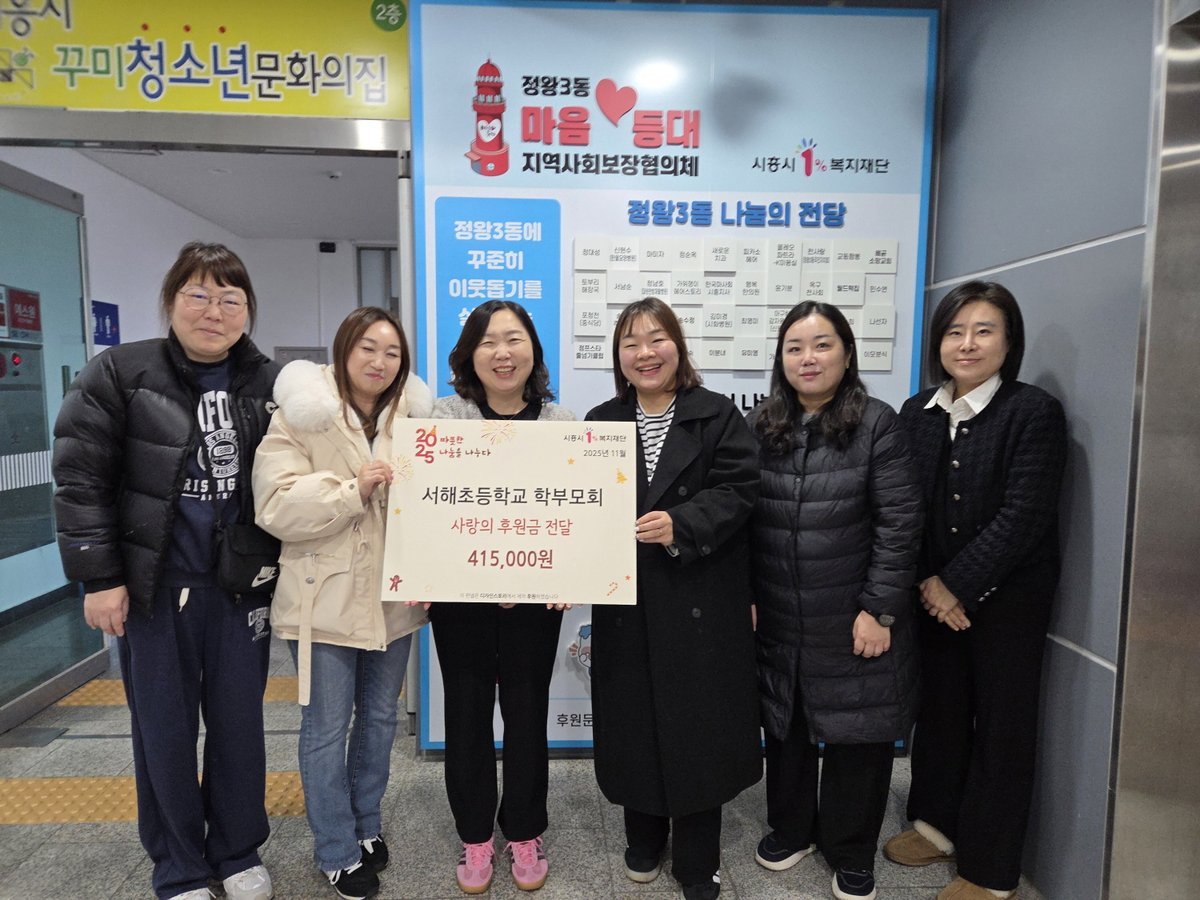 이번 기부는 지난 11월 1일 정왕3동 마을축제추진위원회 주관으로 열린 ‘놀통 페스티벌’에서 서해초등학교 학부모회가 ‘나누고 순환하는 즐거움’이라는 주제로 아나바다 장터 부스를 운영하며 조성한 수익금으로 마련됐다. 기탁된 수익금은 정왕3동 지역사회보장협의체를 통해 관내 취약계층 지원사업에 사용될 예정이다.