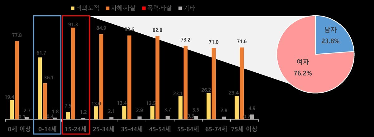 특히, 15-24세의 중독 손상환자 중 91.3%가 자해·자살 목적이었는데, 이 중 여성의 비율이 76.2%로 남성보다 약 3.2배 더 높게 나타났다. 이는 젊은 여성층이 시도하는 자해·자살에 대한 예방대책 마련이 우선순위 과제임을 의미한다. 또한, 0-14세는 비의도적인 사고에 의한 경우가 61.7%를 차지하여, 어린이 및 청소년 중독사고에 대한 예방교육이 중요함을 알 수 있다. 이를 위해 질병관리청과 중앙손상관리센터에서는 청소년 중독사고 예방을 위해 ‘찾아가는 청소년 의약품 오남용 예방교육’을 실시한 바 있다.