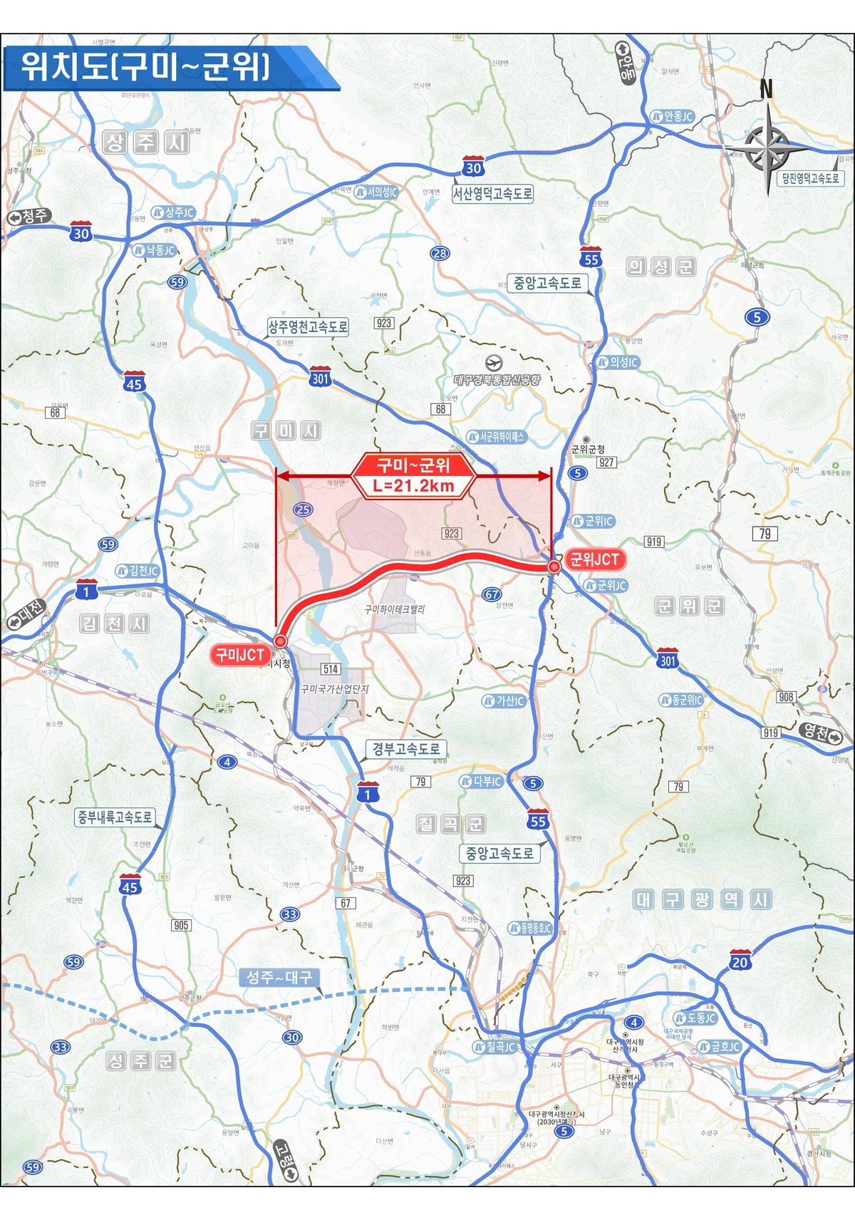 구미와 군위를 연결하는 구미-군위 고속도로는 대구 북부 중앙고속도로와 경북 서부 경부고속도로를 동서로 연결하는 국가간선도로망이며, 왕복 4차선 연장 21.2km 규모로 총사업비 1조 5627억 원을 투입해 2029년 착공을 목표로 국가 재정 사업으로 본격 추진 된다.