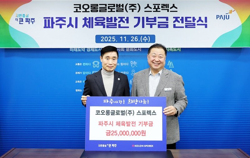 [금요저널] 파주시는 코오롱글로벌㈜이 지난 26일 파주시 체육 발전을 위한 기부금 2천5백만 원을 전달했다고 밝혔다.
