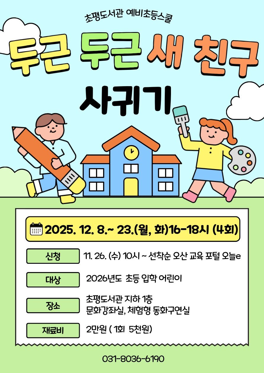 [금요저널] 오산시 초평도서관은 오는 12월 8일부터 23일까지 7세 어린이를 대상으로 예비초등스쿨 「두근두근 새 친구 사귀기」 프로그램을 총 4회 운영한다고 밝혔다.