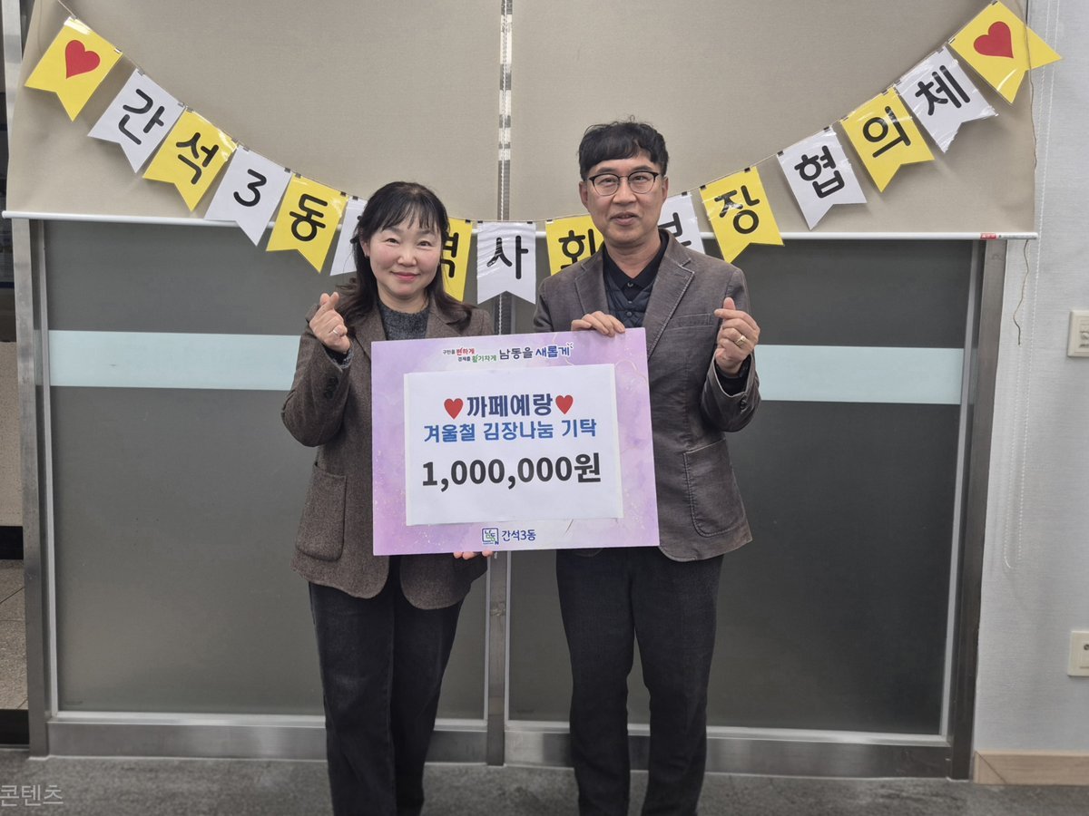 [금요저널] 인천시 남동구 간석3동 행정복지센터는 ‘까페예랑’으로부터 소외된 이웃을 위한 김장 나눔 후원금 100만 원을 기탁받았다고 28일 밝혔다.