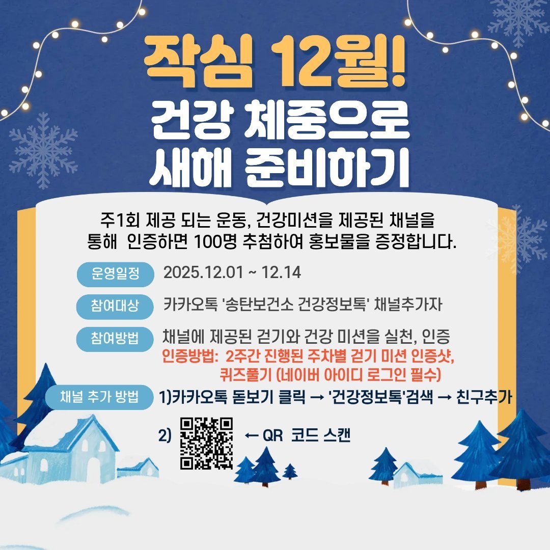 [금요저널] 평택시 송탄보건소는 건강한 생활 습관으로 새해를 맞이할 수 있도록 12월 1일부터 2주간 ‘작심 12월! 건강 체중으로 새해 준비하기’챌린지를 운영한다고 밝혔다.