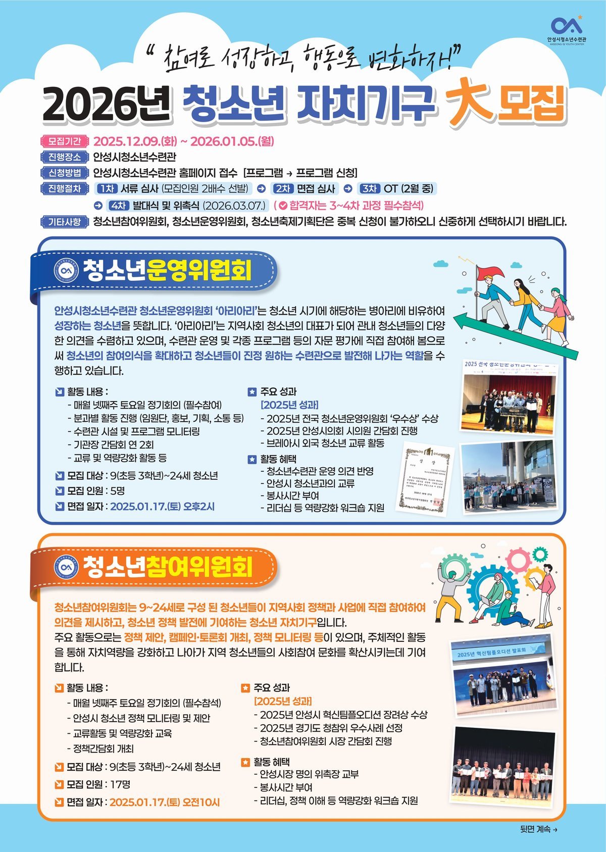 [금요저널] 안성시청소년수련관은 청소년이 지역사회의 구성원으로 참여하고 스스로 기획·운영하는 활동을 지원하기 위해 ‘2026년 청소년 자치기구’ 신규 청소년을 모집한다.