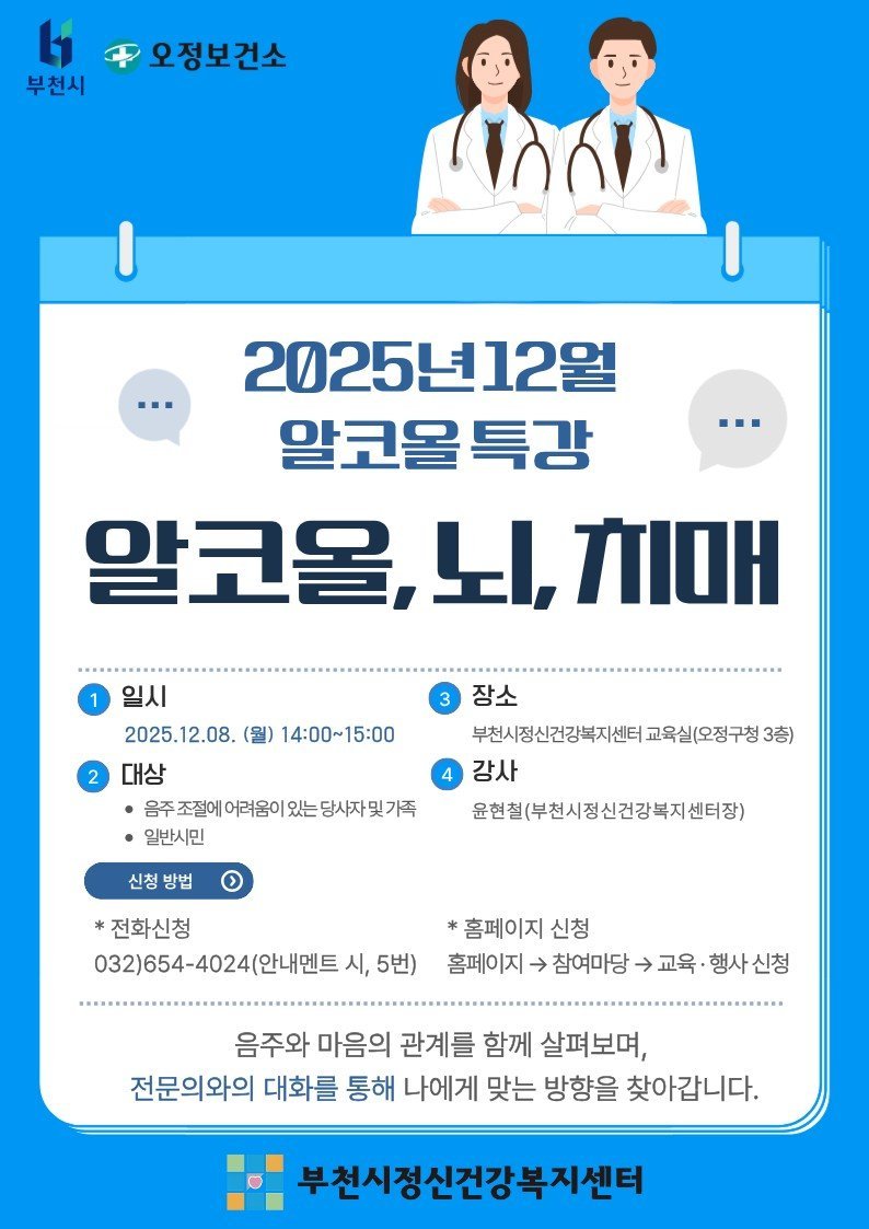 [금요저널] 부천시는 부천시정신건강복지센터와 함께 알코올이 뇌에 미치는 영향을 주제로 한 특강을 12월 8일 오후 2시부터 오정구청 3층 교육실에서 진행한다.
