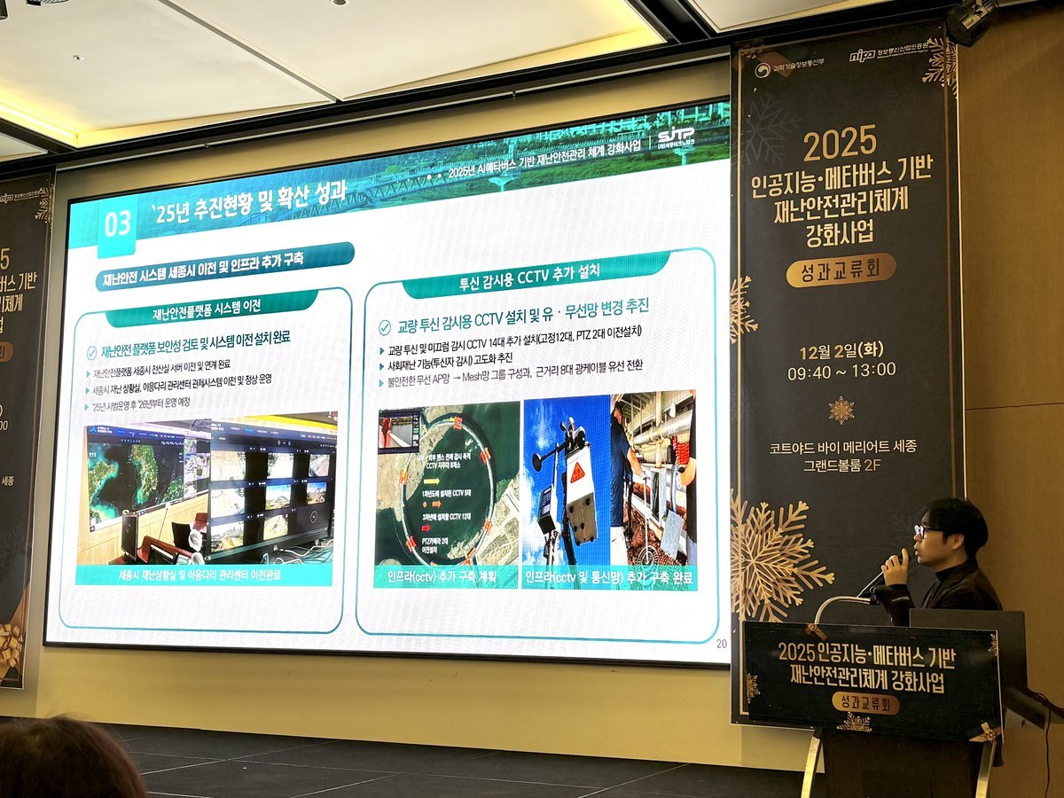 [금요저널] 세종특별자치시가 2일 코트야드바이메리어트세종에서 열린 ‘2025년 인공지능·메타버스 기반 재난안전관리체계 강화사업 성과교류회’에서 인공지능 기반 재난안전관리 구축 사례를 공유했다.