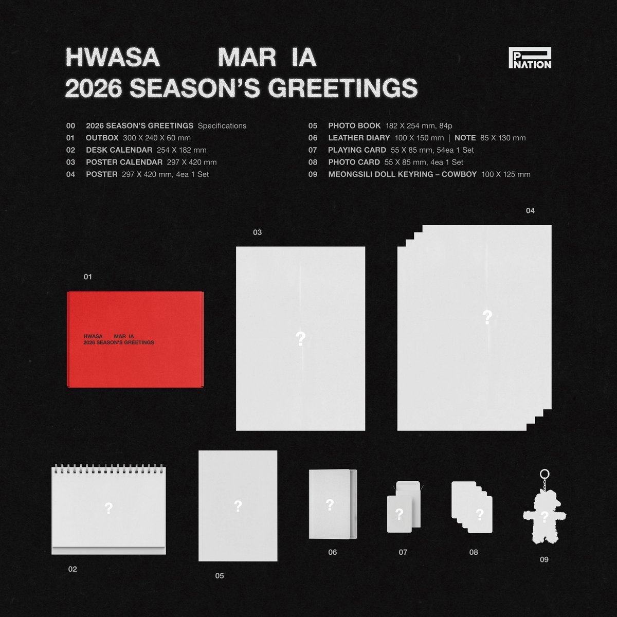 화사는 2일 오후 2시 화사 공식 팬 커뮤니티와 에버라인을 통해 ‘HWASA 2026 SEASON’S GREETINGS [MAR IA]’의 예약 판매를 시작했다.