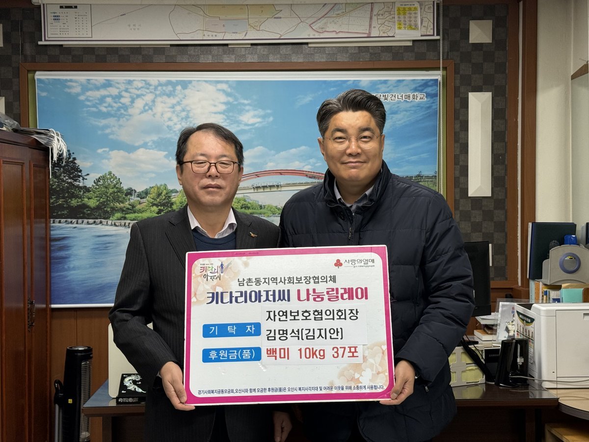 [금요저널] 오산시 남촌동은 12월 3일 남촌동 자연보호협의회 김명석 회장이 관내 저소득층 및 취약계층을 위해 백미 10kg 37포를 기탁했다고 밝혔다.