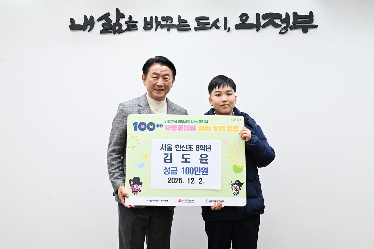 [금요저널] 의정부시는 12월 2일 서울한신초등학교 6학년 김도윤 군이 ‘100일간 사랑릴레이 배턴 잇기’에 동참하며 성금 100만 원을 기부했다고 밝혔다.