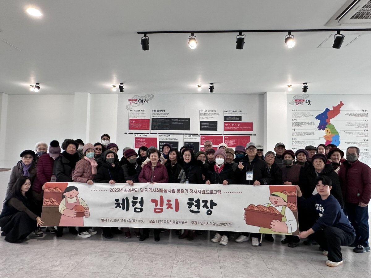 참여 어르신들은 양주골김치체험박물관의 전시 공간을 둘러보며 김치의 역사와 문화를 이해하고, 이어진 김장 체험 프로그램에서 직접 김장김치를 담가보는 시간을 가졌다.